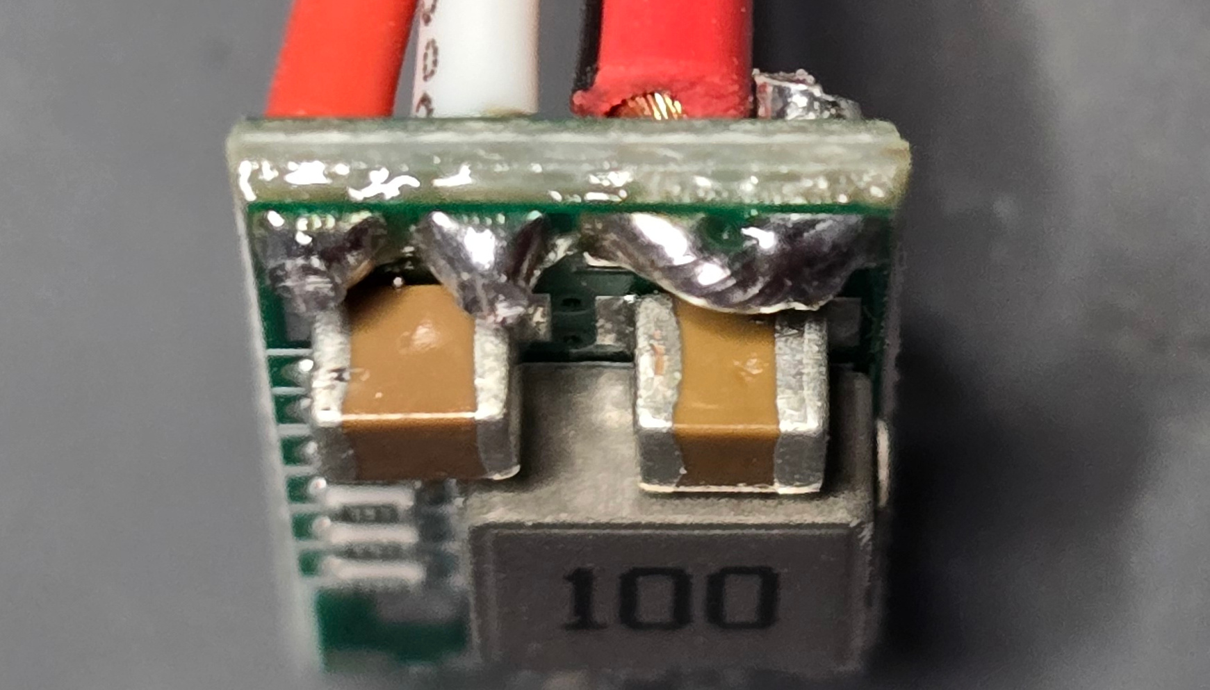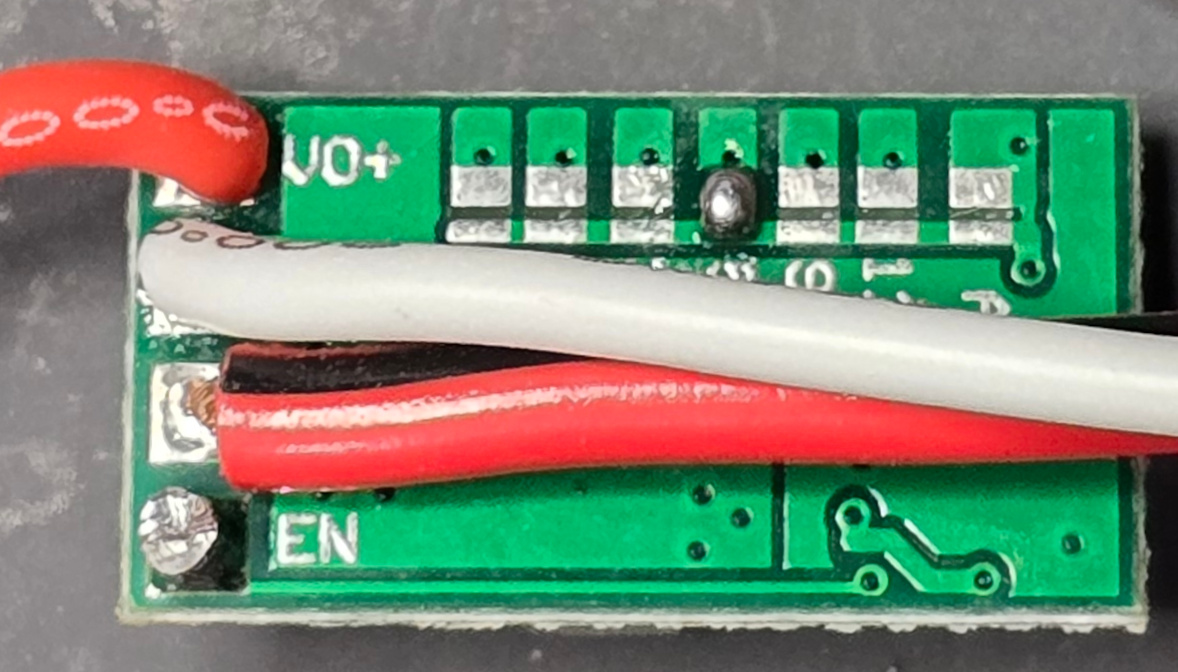 Strip and feed the white wire through the GND hole and solder in place. Then strip and feed the red wire through the VO+ hole and solder in place. Trim both wires.