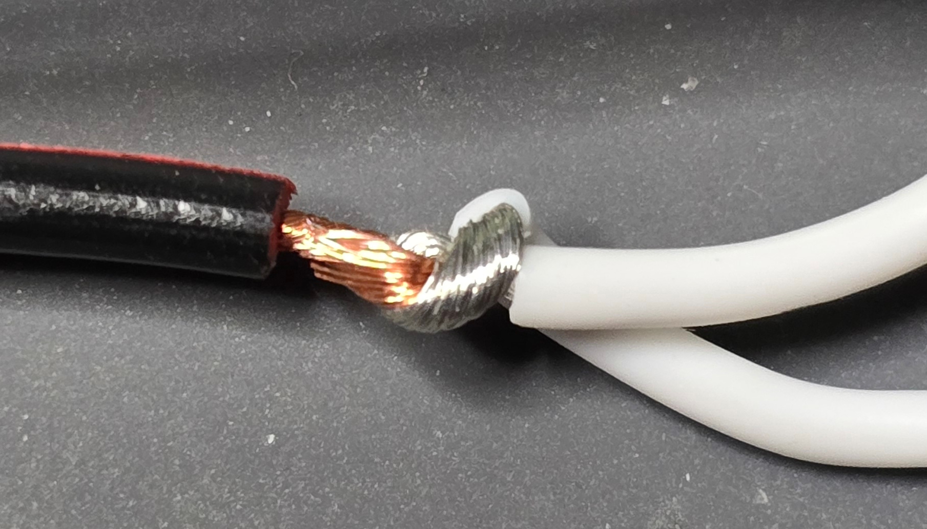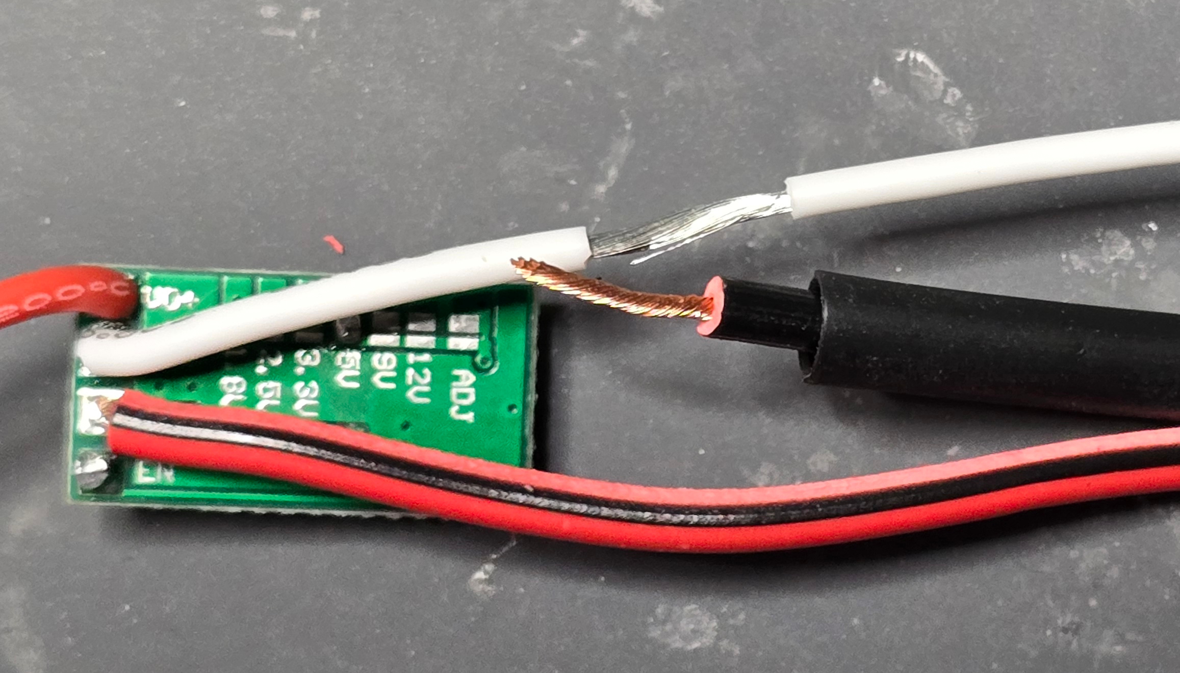Strip about 1cm of the white wire just after the end of the PCB. Strip about 1cm of the black wire from the barrel jack and feed the 3/16" heat shrink on.