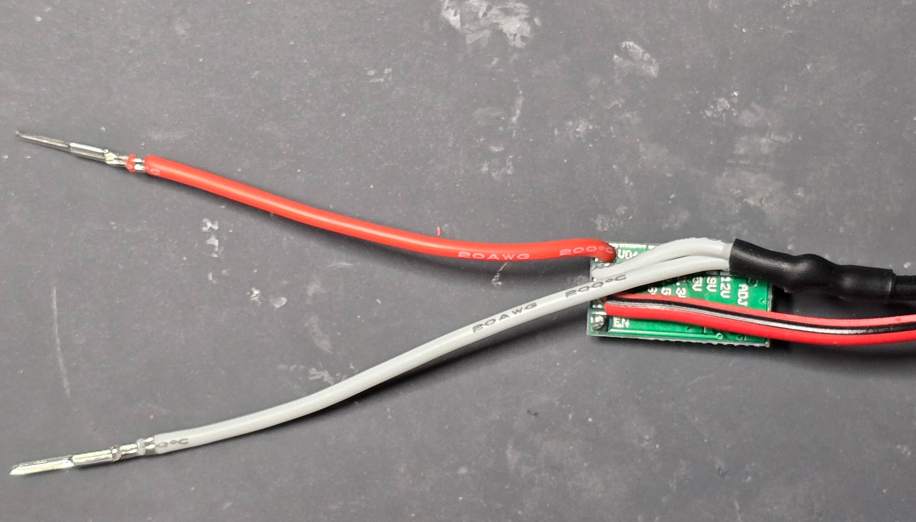 Trim the ends of the red and white wires to the same length. Crimp a male jst pin on each wire